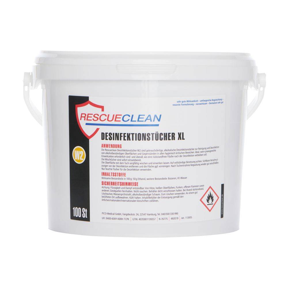 Die RescueClean W2 Desinfektionsücher im Spendereimer sind gebrauchsfertige, alkoholische Desinfektionstücher zur Reinigung und Desinfektion von alkoholbeständigen Oberflächen und Gegenständen in allen hygienisch kritischen Bereichen. Ideal, wenn praxisgerechte Einwirkzeiten erforderlich sind und überall und wo eine rückstandfreie Fläche nach der Desinfektion verbleiben soll. Die Wischtücher sind sofort einsatzbereit und auch sehr gut für die Einsatzstellenhygiene geeignet. Ein Aufsprühen der Flüssigkeit entfällt, ein gesundheitsschädlicher Sprühnebel wird nicht erzeugt. Die Eimer sind wiederbefüllbar. Inhalt: 100 Blatt.