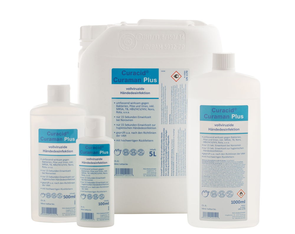 Curacid Curaman Plus ist hochwirksam mgegen Viren und zeichnet sich dank der Rückfetter durch eine sehr gute Hautverträglichkeit aus. Der hohe Anteil an Ethanol ermöglicht auch eine sehr gute Wirksamkeit gegen Noro-Viren in kurzer, praxistauglicher Zeit.