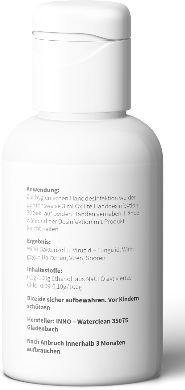 Anwendung : Zur hygienischen Handdesinfektion werden portionsweise 3ml Oxilite - H 60 Sek. auf beiden Händen verrieben. Hände während der Desinfektion mit Produkt feucht halten.